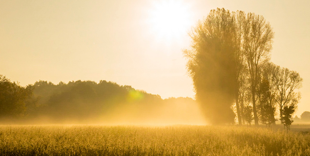 Sonnenuntergang am Niederrhein. Feld und Pappeln, Wald im Hintergrund.